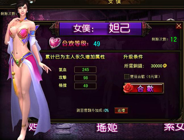 玩家完成指定劇情後可獲得第一位女僕妲己,從此每日可有美豔的女僕伺候,更可與女僕進行合歡,永久增加屬性,提高戰力。這樣美好而讓人充滿幻想的待遇,大家是不是很心動呢?