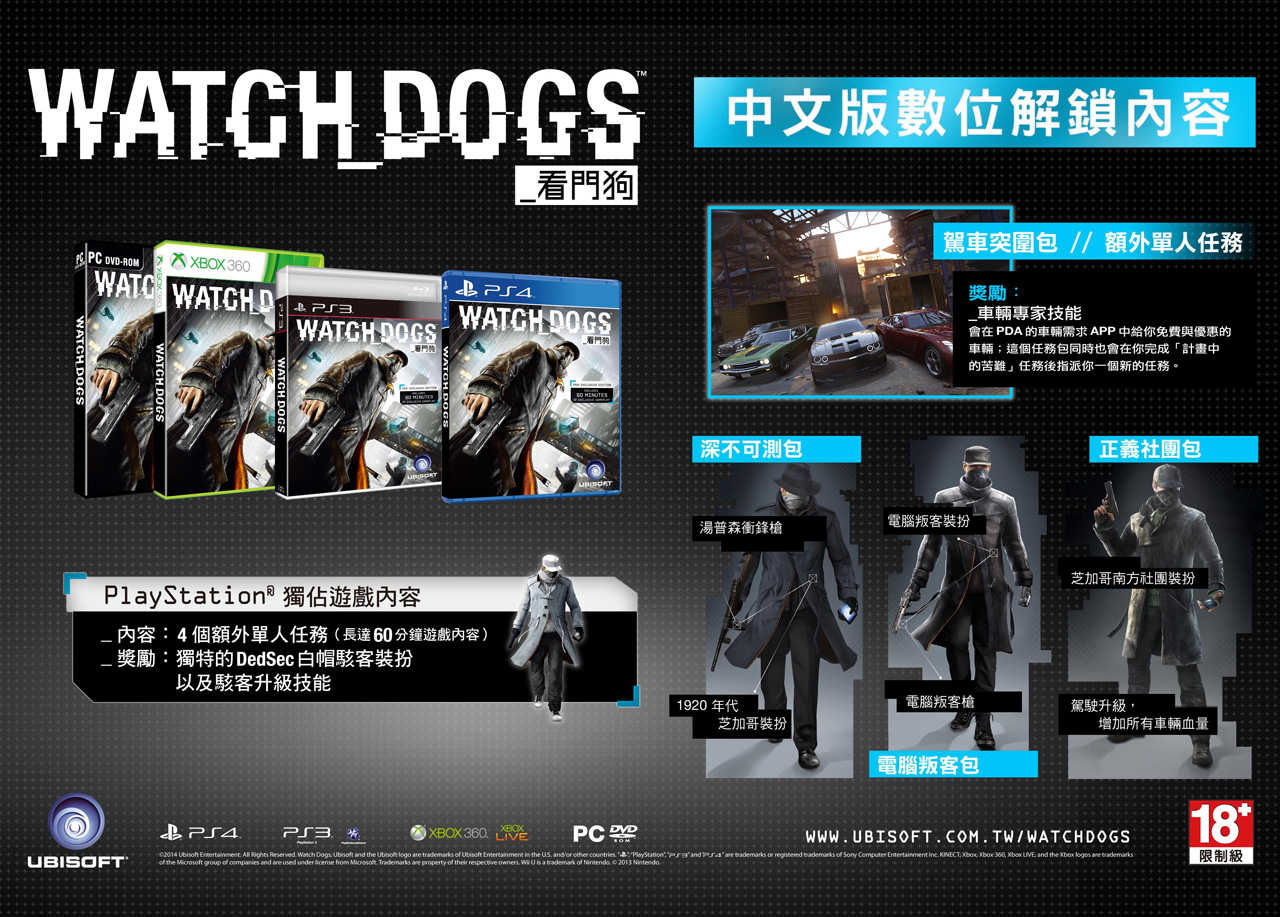 Ubisoft 今日公開即將於 PS4、PS3、Xbox 360、PC 平台推出的動作冒險遊戲《看門狗》最新預告片「歡迎來到芝加哥」,並且宣布首批中文版將收錄額外單人任務「駕車突圍包」以及 3 種遊戲內物件組合,帶來額外角色裝扮、武器以及技能。已預購各平台中文版的玩家將全面升級為中文初回版,遊戲將在 6 月 26 日於台灣上市。