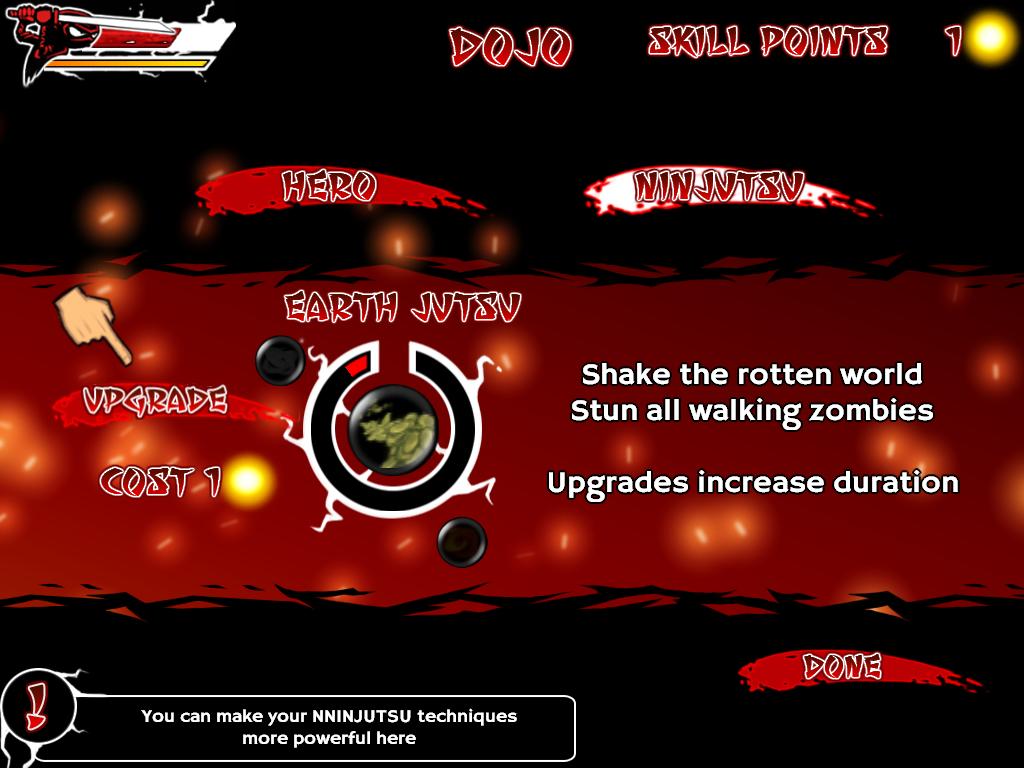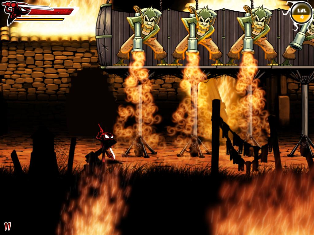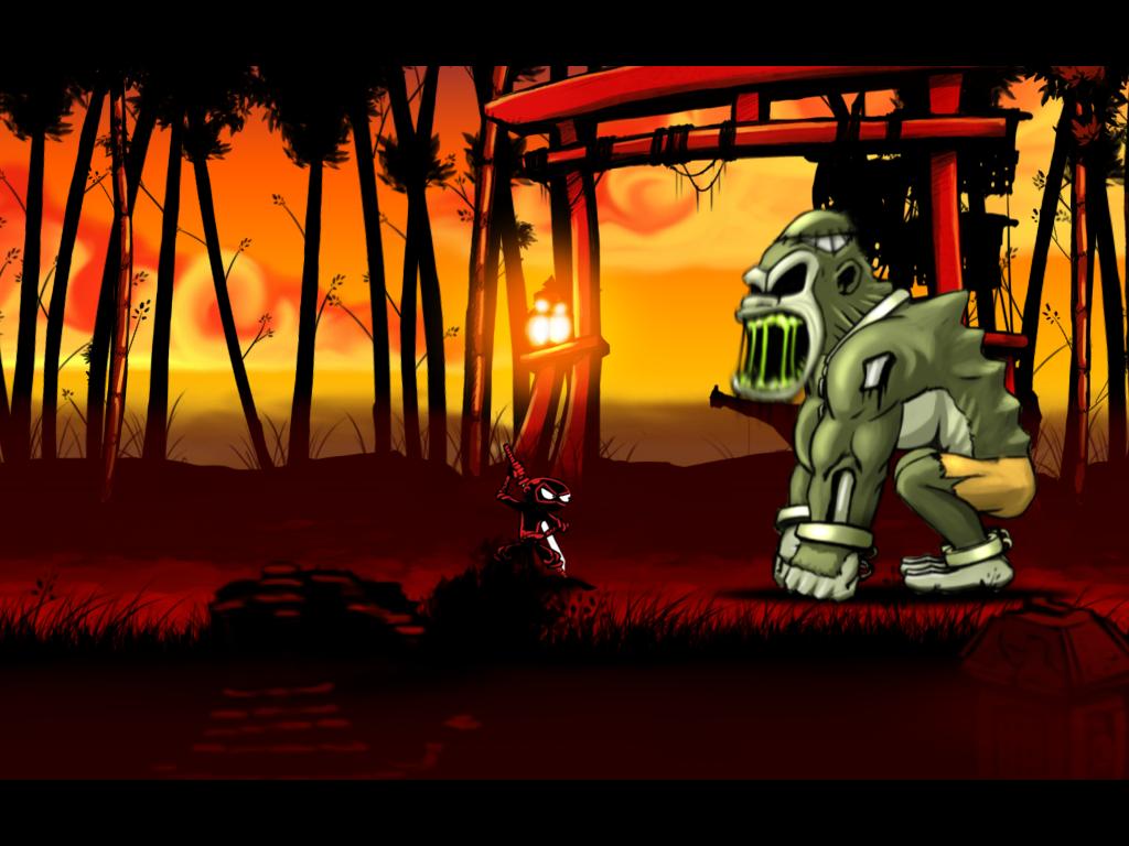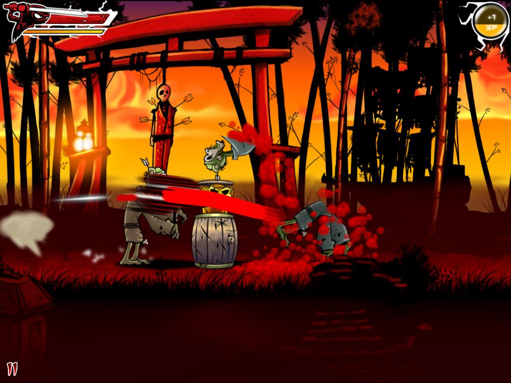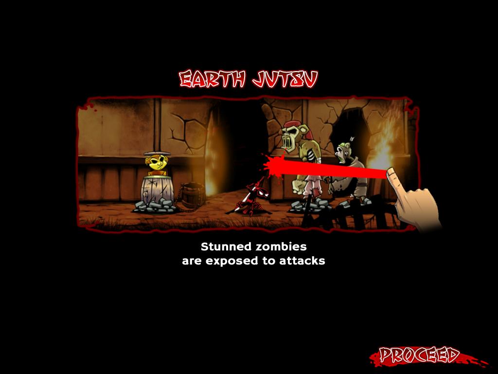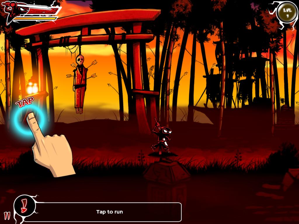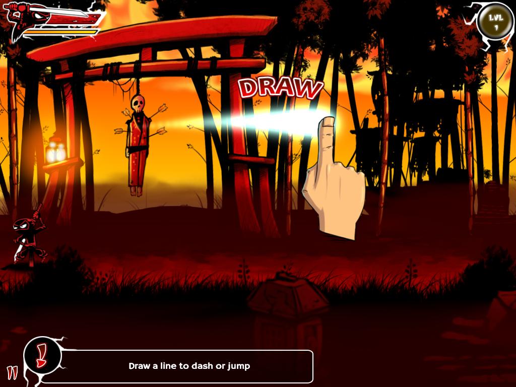 在畫面上輕點螢幕人物就會往指定的位置移動,然後以手指畫線,主角忍者就會跟著直線的軌跡對該處發動斬擊,斬擊的攻擊有效範圍長度取決於左上角的黃色計量表多寡,其上紅色長條則是主角的生命值一但完全消失也就代表死亡。