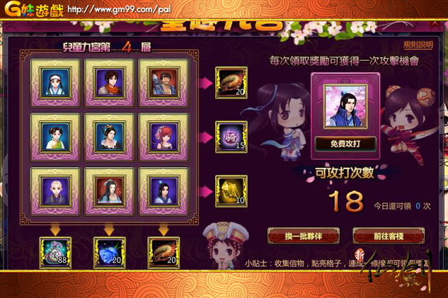 除了蒐集夥伴外,少俠每領取一條線路上的獎勵,便可獲得一次免費攻打兒童偶像BOSS的機會,成功挑戰BOSS後,有幾率獲得可在仙劍客棧兌換金色夥伴所需的金魂唷!
