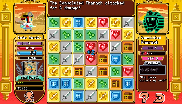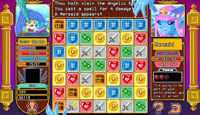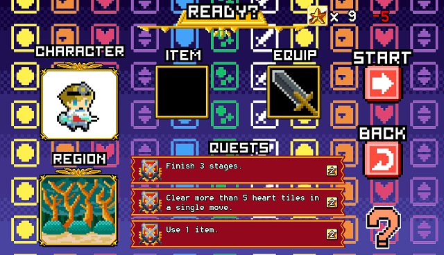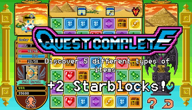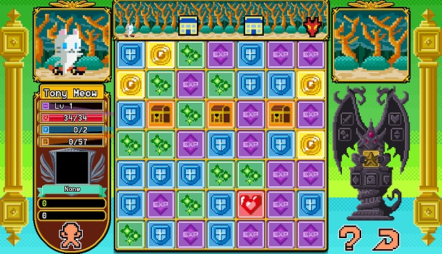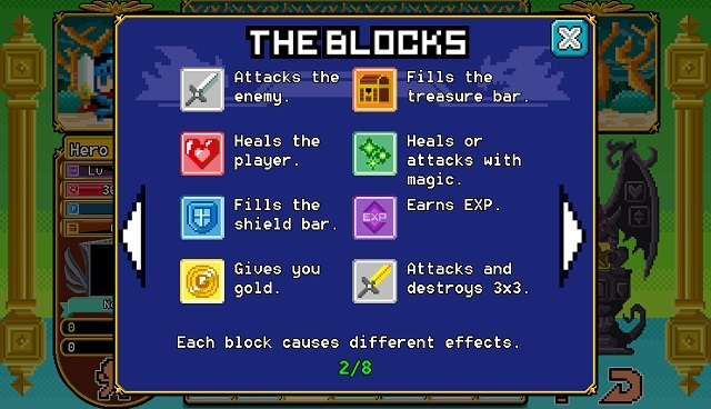 進入遊戲後可以在畫面上方看到一個橫軸畫面,它代表的是該關卡的行進長度,行進過程中會遇到怪物,只要串消兩個並連以上的「劍刃方塊」與「魔法方塊」就能對怪物進行物理與魔法的攻擊,串消「愛心方塊」可回復角色的體力,「盾牌方塊」則是增加格擋能量抵消怪物的傷害,其餘的「金幣方塊」可以得到黃金、「寶箱方塊」可以累積尋寶能量(當左方黃色的尋寶能量滿檔時可以獲得一件道具)。