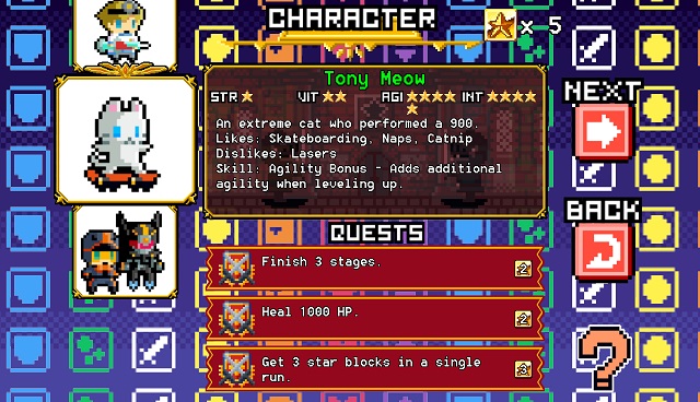 解鎖的角色都有自己獨特的技能,「滑板貓」升級時可以額外增加一點敏捷,對戰鬥十分有幫助