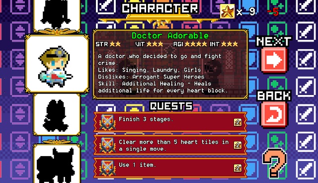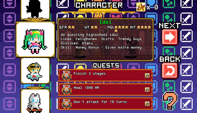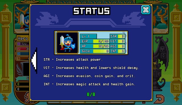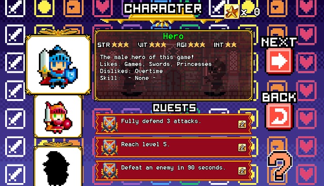 遊戲初期玩家可以選擇英雄與女英雄兩個角色,外觀看起來像歐洲中古騎士,數值方面則是力量、體力、敏捷與智力等四項能力平均分佈的泛用型角色,若想使用其他角色闖關,可以使用「星星方塊(Star Block)」解鎖新角色。