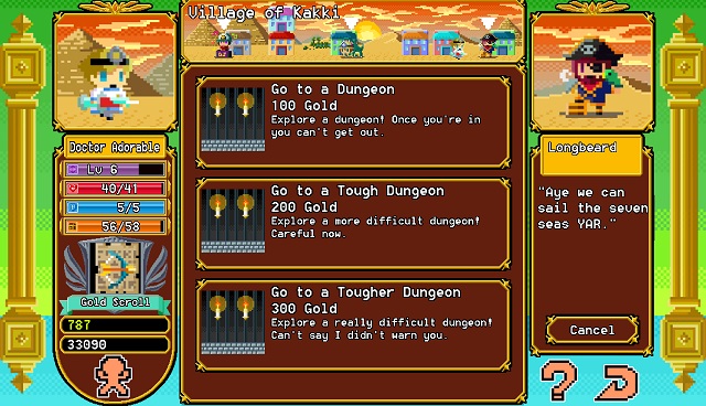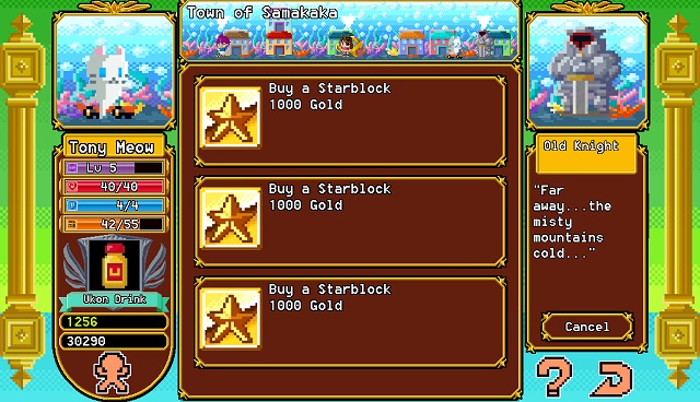 Block Legend)》的流程比較類似早期的動作遊戲或街機遊戲,失敗就必須重新來過,角色的等級並不會保存,但是可以累積星星方塊以及在城鎮商人處買到的道具與裝備,玩家若想創造更高的分數,必須搭配優質的裝備與角色,因此累積星星方塊的數量是首要之務。