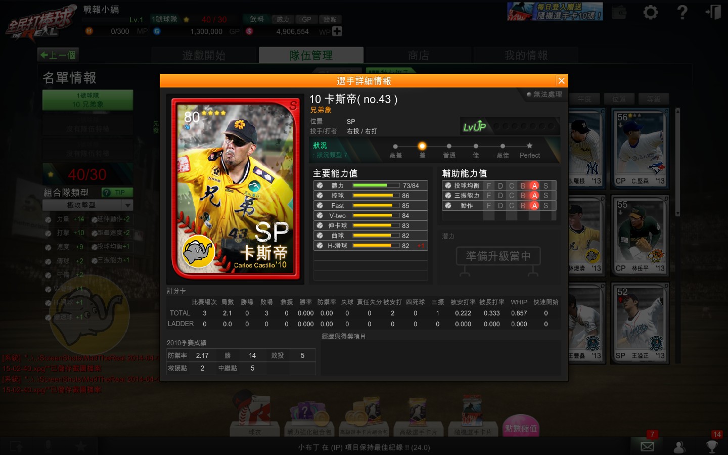 改版同步新增 3 張 CPBL 相當知名選手的「S 卡」,讓玩家大幅強化球隊戰力,獲得更多勝利。其中投手方面,兄弟象的「卡斯帝」共出賽 36 場,防禦率達 2.17,10 年榮獲年度勝投王、防禦率王及最佳 10 人投手等獎項,傲人的三振功力,是玩家不可或缺的球員卡。