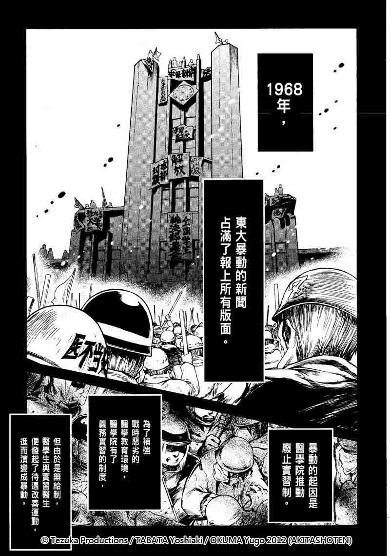時間回到了動盪不安的 1960 年代,還只是個醫科學生的黑傑克,從未想過自己將來可能成為密醫,而且總將病患擺在第一,即時在生死一瞬的戰場上,也能不顧一切的醫治傷者。手塚治虫的忠實粉絲田畑由秋擔綱腳本,將當時所發生的學運改革、越南戰爭等題材融入故事,但在時局的黑暗、社會的壓迫,讓黑傑克逐漸成為我們熟悉的模樣。