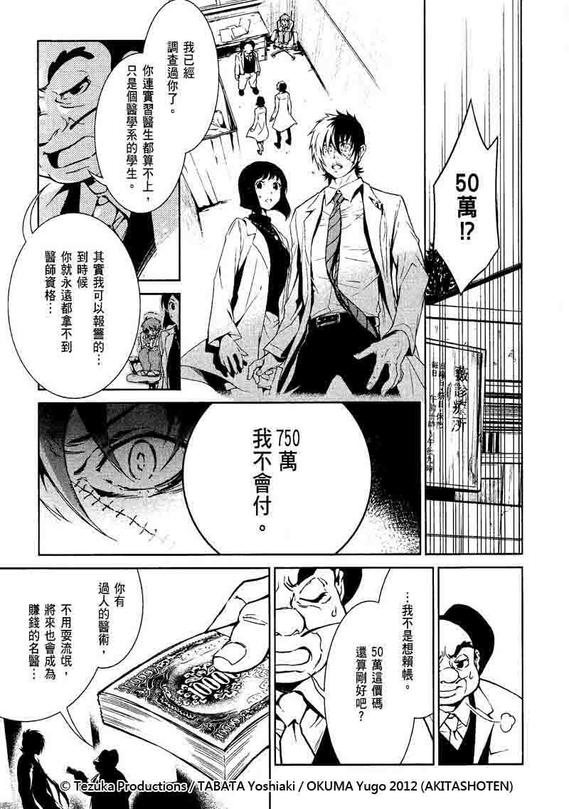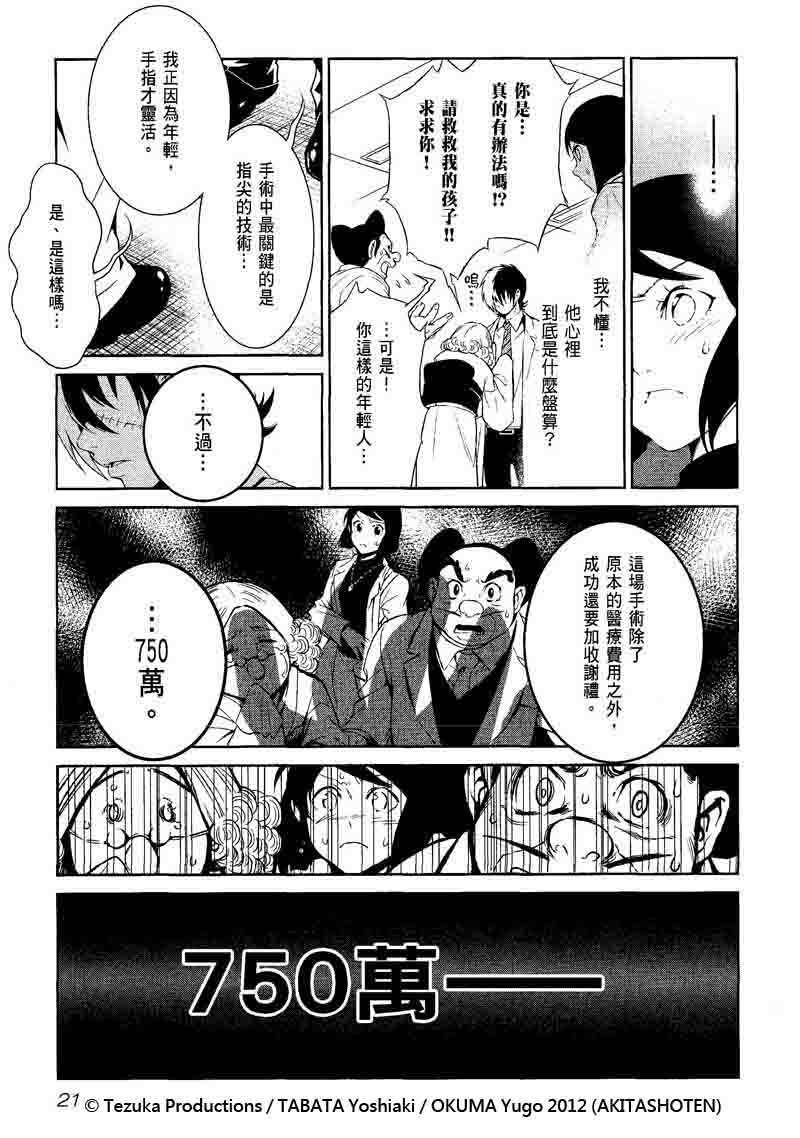 因為第一話只是個過場短篇的關係,手術理所當然的成功了(?)。其實間黑男為了磨練自己,平時就會用魚來練習手術。但在手術成功後,孩童父母卻反悔當初說好的醫療費用,只給了區區 50 萬。