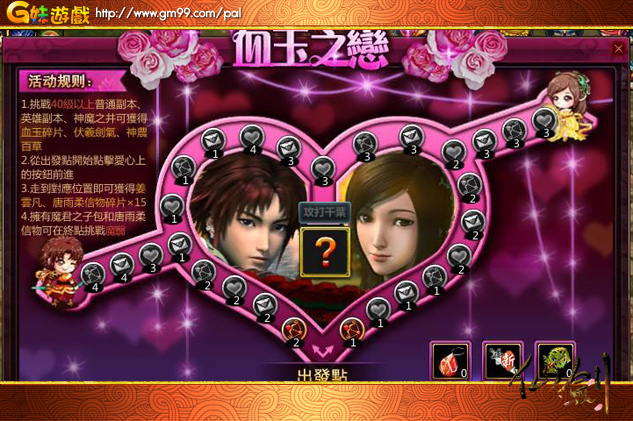 在《新仙劍》中,官方還同步推出「血玉之戀」版本事件,少俠需要在限定的時間內,在規定的副本和神魔之井中,蒐集「血玉碎片」、「伏羲劍氣」和「神農百草」等物品,來體驗凡柔之間的愛心遊戲!成全兩人的愛意可是獎賞多多,除了珍貴道具外,還有機會獲得唐雨柔、姜雲凡等信物碎片喔!