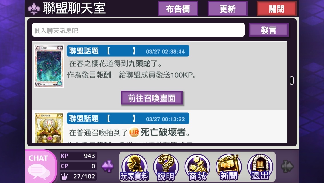 若聯盟中有人獲得 SR 以上卡片並發言時,則做為發言報酬將贈送每位聯盟成員 100KP