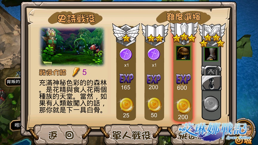 副本難易度共分為 1-4 顆星,依難度將會給予對應的經驗和金幣獎勵。