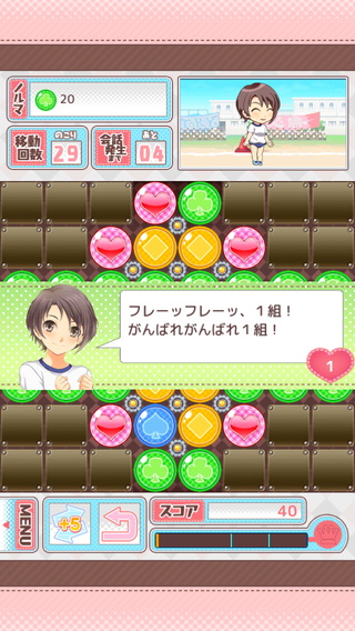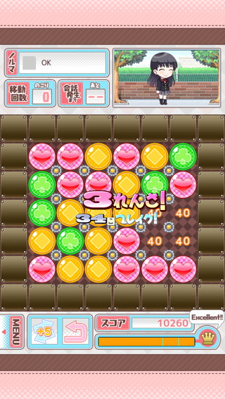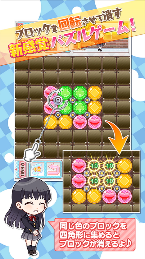 戀鎖反應》是一款結合戀愛要素的益智遊戲,玩家要在限制步數內拉動方塊間的「齒輪」來旋轉方塊,將同色方塊湊成四角形即可消除。此外,若是消去的方塊可連接至其他同色方塊,還可引發「誘爆」效果,一次連鎖消去越多方塊獲得分數也越高。當消除「愛心方塊」時即能與女主角進行對話,收集完關卡中所有的對話後,將在相簿內追加可觀賞的「回憶」。