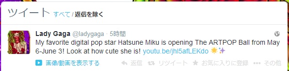 女神卡卡在 Twitter 上表示:「我喜愛的虛擬偶像初音未來將擔任 The ARTPOP Ball 的開場嘉賓,讓我們來看看她到底有多麼可愛!」並附上初音未來官方提供的經典歌曲「World is Mine」演唱會影像。