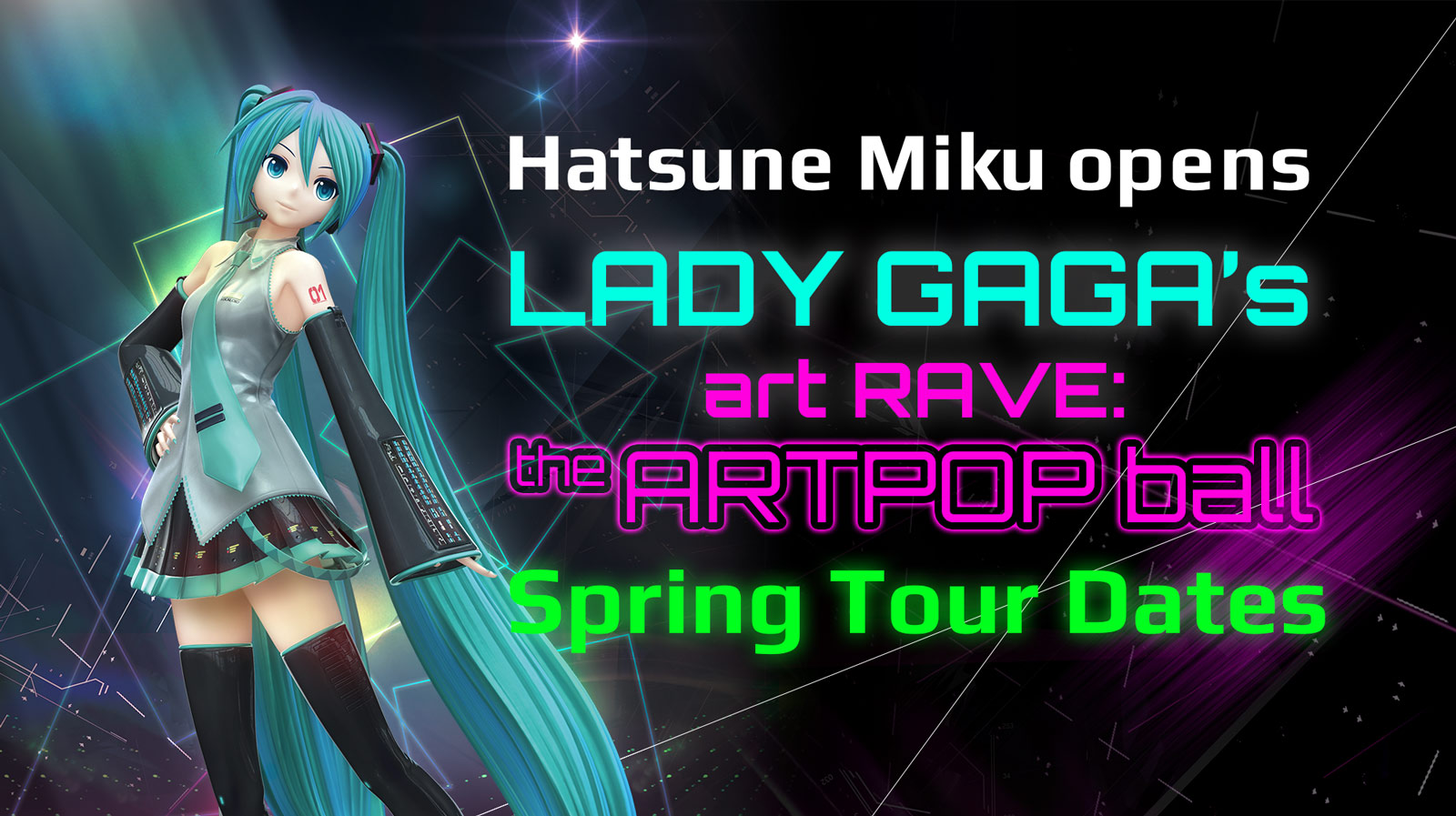 知名歌手 女神卡卡(Lady Gaga),今(16)日在官方 Twitter 宣布,將於 5 月 6 日起至 6 月 2 日舉行的「The ARTPOP Ball」北美巡迴中,請來日本虛擬偶像初音未來擔任開場嘉賓的消息。