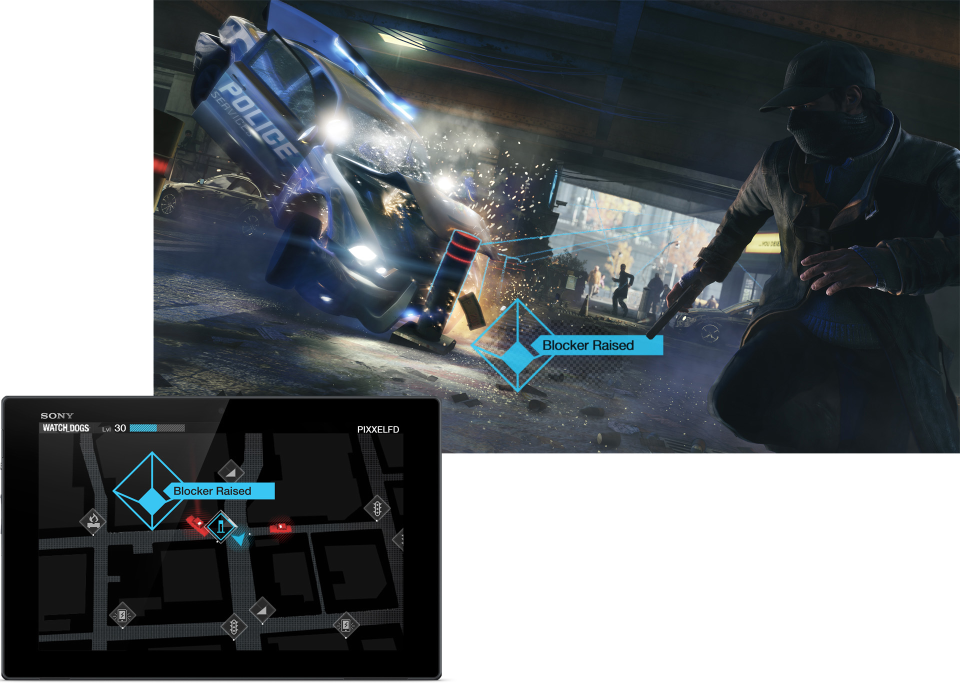 看門狗》遊戲,與家用主機或 PC 上的玩家、無論他們在同一張沙發或是彼此相距數千公里遠,一同即時遊玩並且分享相同的遊戲體驗。