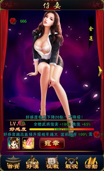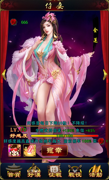藉由遊戲內的「侍妾系統」,玩家可以消耗鮮花寵幸侍妾提升主將和侍妾的好感度,侍妾等級越高,獲得的傷害及免傷加成越高,並可開啟新形態和技能。此外,侍妾可伴隨出陣,戰鬥時己方武將受到傷害或消滅敵方武將都會增加侍妾怒氣值,怒氣滿時侍妾則可釋放專屬技能;侍妾心情的好壞會影響侍妾技能的效果加成,就如同玩家的伴侶一般。