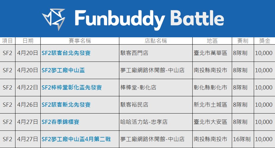 隊即可開賽,每場比賽祭出總獎金 1 萬元(冠軍可獲得獎金 5000 元、積分 50,亞軍 3000 元、積分 30,季殿軍各 1000 元、積分各 10,預計 6 月底進行積分結算,參加兩場以上的賽事,積分達 80 分以上的隊伍,即有參加華義嘉年華百萬大賽的資格,爭奪 200 萬總獎金。