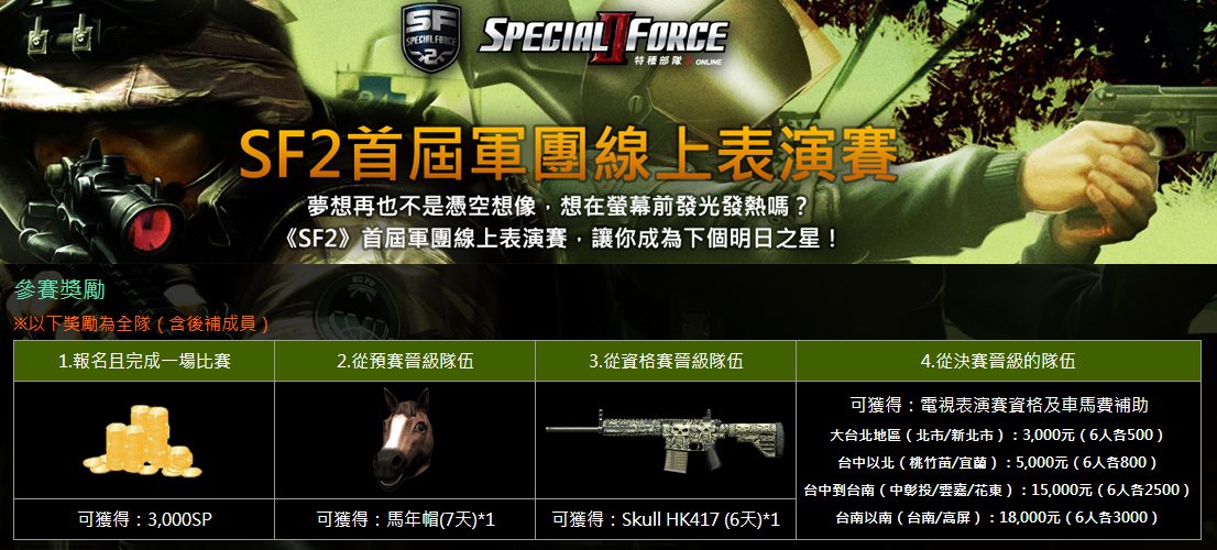 Special Force 2》知名軍團 PTMm、PTMx、SNSplus、eSportNucleus 來進行比賽,這些軍團集結不少台灣冠軍電競選手、前職業電競選手、WCG 世界電玩大賽國手選拔亞軍等高手,他們將互相進行關主爭霸賽,冠軍隊伍能成為關主,與線上軍團表演賽的週冠軍進行對戰。
