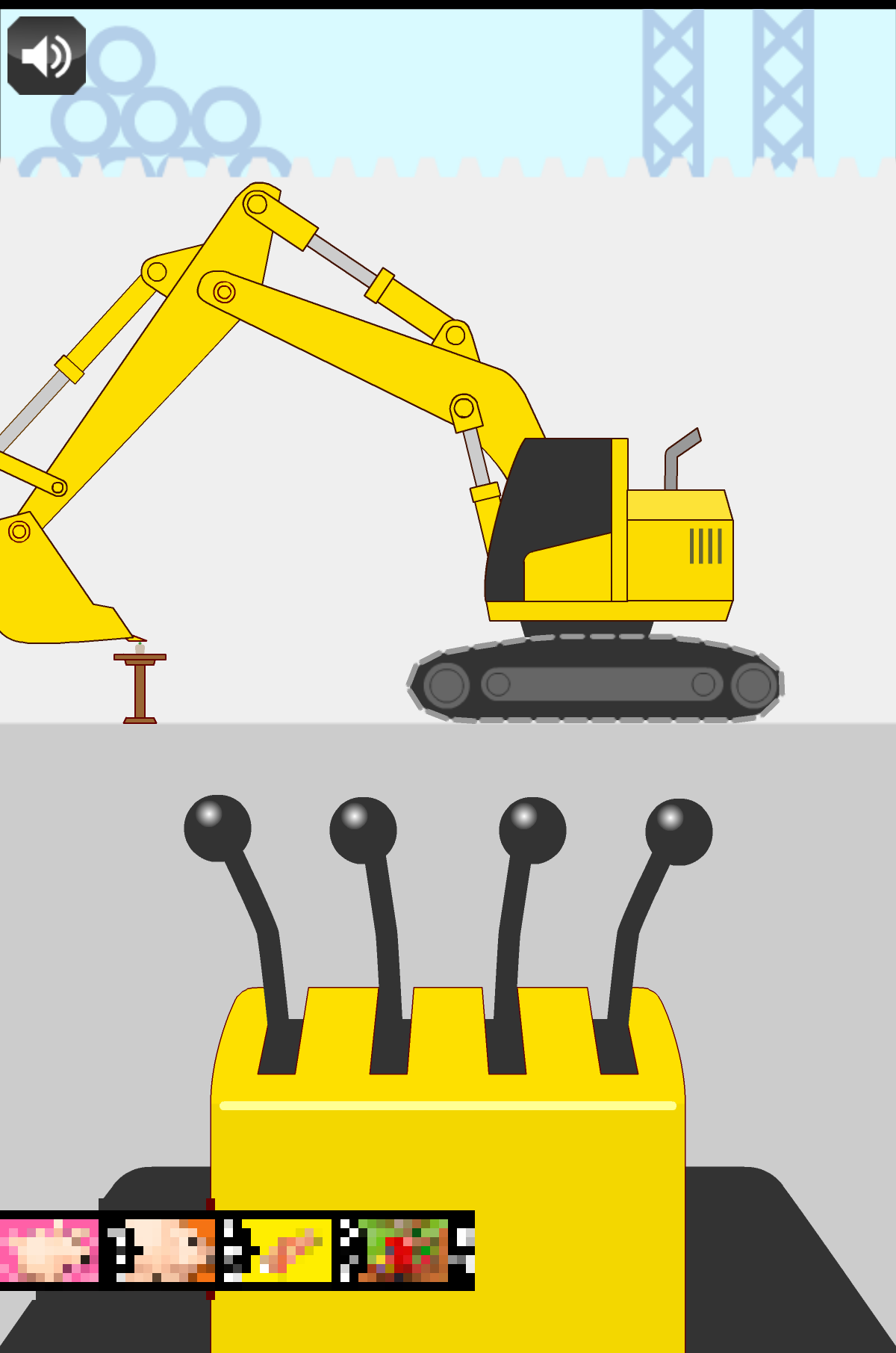 筆者在第一次遊玩的時候因為還搞不清楚狀況,所以就測試這些操作桿的使用方式,然後就前進準備挑碗豆,但瞬間就失敗了....不過沒關係,反正不過就是挑碗豆而已,操作桿也知道該怎麼用了,於是便再挑戰一次。先將挖土機開到前面去,然後屏氣凝神的調整怪手位置,慢慢地…慢慢地…然後…
