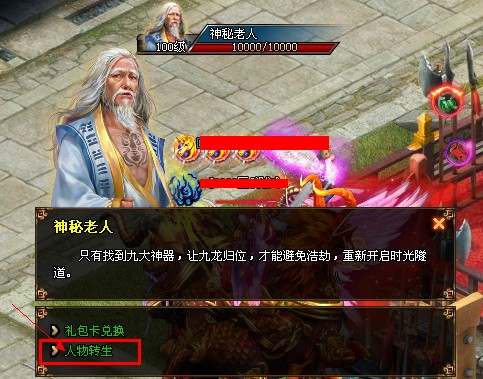 當玩家轉生系統開啟之後,即可前往「升平城」尋找神秘老人。與神祕老人對話,選擇「人物轉生」選項,即可打開轉生介面,進行第一次轉生。