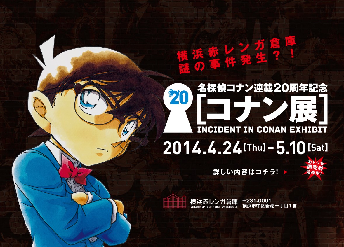 選在日本黃金週登場的「柯南展」,預定將自 4 月 24 日起至 5 月 10 日一連 17 天於橫濱紅磚倉庫登場。本次的展覽主打入場參觀者可以實際體驗解謎的樂趣。參觀者在入場時,必須先在入口處從「江戶川柯南」、「工藤新一」、「怪盗基德」、「服部平次」四款不同的偵探筆記中挑選一款來進行解謎挑戰,不同的筆記將會有不同的提示和進行流程。