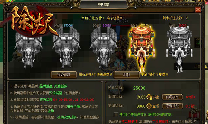 劫鏢完成後,可獲得大量獎勵,以金幣獲得為主。但是,只有高調護送的鏢車可以被劫鏢,每天可以劫鏢5次。