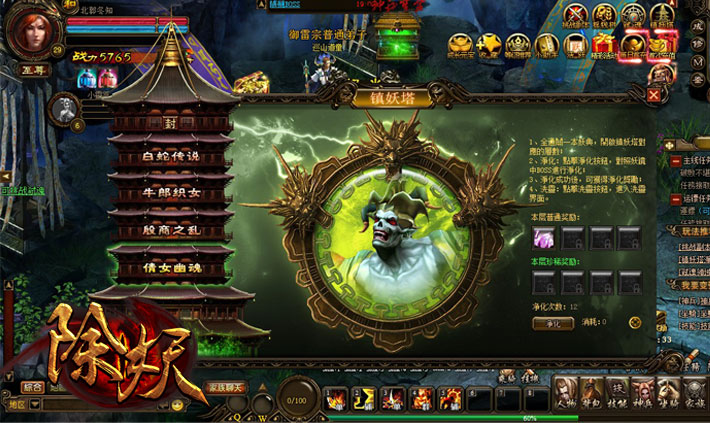 玩法內容:《除妖》鎮妖塔分為4層,分別為:倩女幽魂、殷商之亂、牛郎織女、白蛇傳說。只有通過相應的《妖典》章節,才能進入相應的鎮妖塔層數。