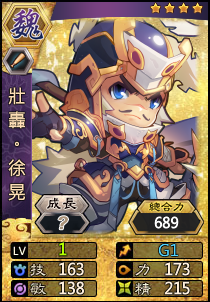 曹魏「五良球將」,一柄巨斧球棒使得威猛無匹。治軍嚴謹,麾下球軍意志勝鐵。與各方神將交戰後急遽成長,人稱「壯轟.徐晃」。