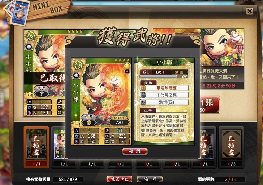 本週推出全新「MINI BOX」抽卡系統,首發搶先登場的為究極金卡人氣武將 -小小郭以及全新銀卡神之球將-高岡!