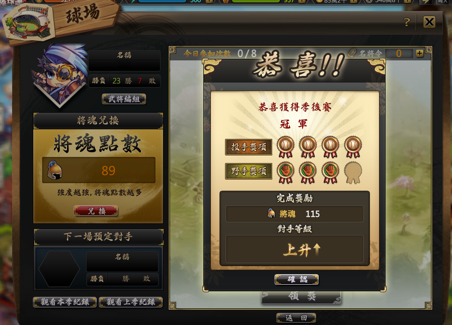 玩家可在「名將聯賽」中挑戰知名戰役,當難度越高獲得的將魂就越高,將魂可兌換各種獎勵。「將魂數」提高可讓玩家更輕鬆兌換各式好禮,快把握機會兌換限定名將吧!