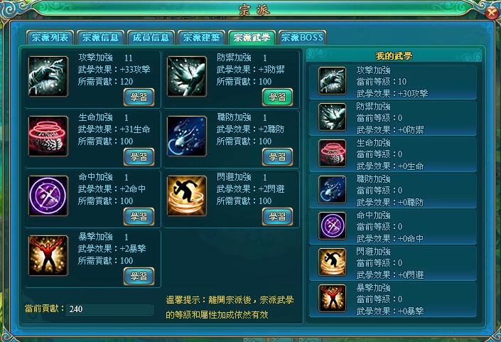 玩家可以利用每日 10 次的宗派任務獲得宗派貢獻,玩家千萬別小看宗派貢獻喔!舉凡是宗派商店、宗派祈福、宗派武學…等,都必須透過貢獻的消耗來進行。宗派武學能直接提升自己的戰鬥力以及防禦力,宗派武學學習後,即使玩家退出宗派,習得的宗派武學依然會永久存在於玩家身上。當宗派等級到達 3 級以上時,玩家可以在宗派領地內召喚出宗派 BOSS!擊殺宗派 BOSS 不僅會掉落珍貴的稀有寶石外,召喚出宗派 BOSS 的成員還可獲得金色裝備喔