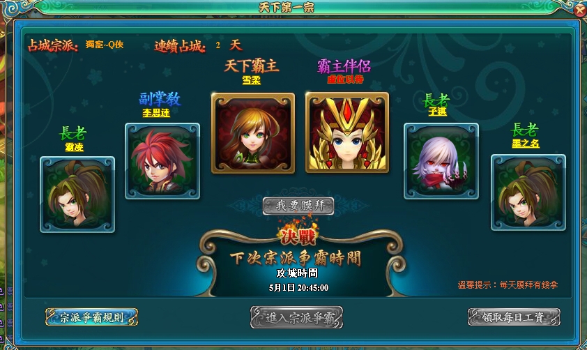 宗派之間的較勁絕對是無可避免的,一旦宗派等級與玩家等級到達一定級別後,可於活動時間內進行勝者為王的宗派爭霸戰。宗派爭霸戰地圖內占領守護獸的宗派為防衛方,而其他宗派則為攻擊方。由於守護獸的存亡是宗派爭霸戰勝負的唯一依據,因此成功摧毀守護獸的宗派即為勝利方。活動時間最長為 30 分鐘,若守護獸中途被摧毀,宗派爭霸戰將立即結束。宗派爭霸戰排名第一的玩家,可獲得酷炫的稱號,戴上閃亮的炫麗稱號還有獨一無二的屬性加成效果唷!