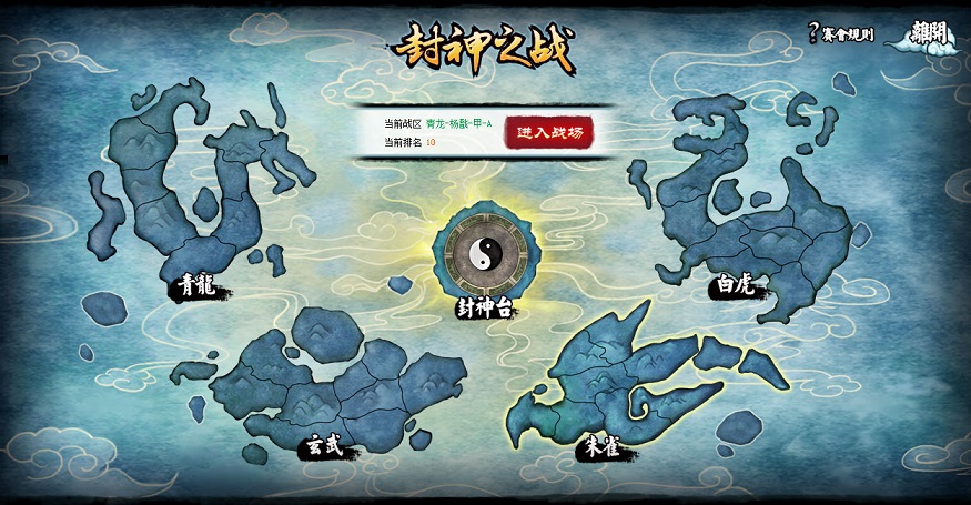 「封神之戰」分為青龍、白虎、朱雀、玄武四聖獸神域4個主戰場。每個聖域下再分刑天、金吒、黃飛虎、巨靈神、齊天大聖、何仙姑、楊戩、嫦娥、女媧、後羿等10個仙府。每個仙府下還劃分10個戰區(戰區一~戰區十),每個戰區又分8個小組A~H,所有的比賽將通過積分賽的方式淘汰和晉級。