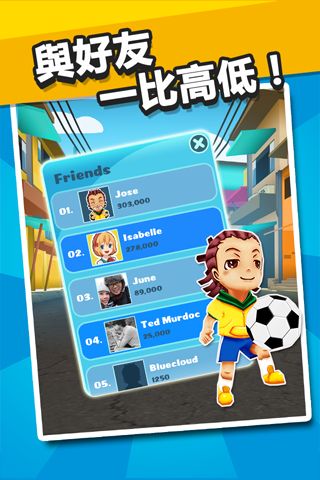 指引足球小夥何塞,在繁華的里約街道上衝刺,專心跳躍躲避前方的所有障礙和逃離後方緊追的裁判員桑托斯,別讓憤怒的裁判員逮到!遊戲玩法很簡單,向上下左右滑動即可躲避障礙物 ,玩家們還可以在遊戲中收集芒果和各種各樣的 power-up 來增加遊戲樂趣!