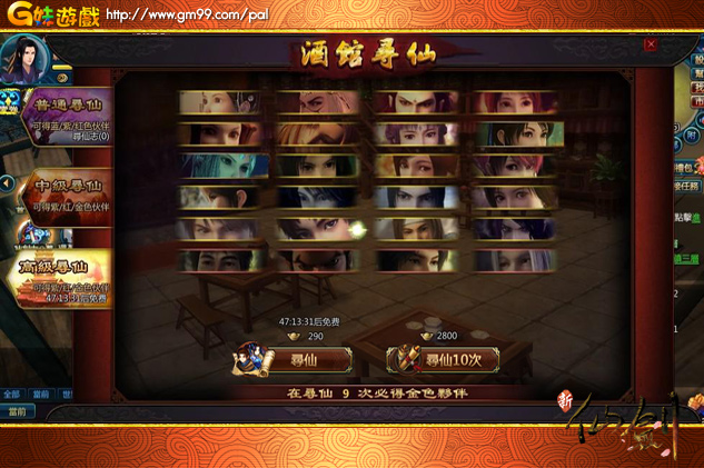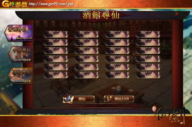 進入尋仙酒館後,少俠可從「普通尋仙」、「中級尋仙」和「高級尋仙」三種模式中,選擇適合的模式,開啟自己的尋仙之緣。不同的尋仙模式邂逅夥伴品質將有所不同,除了需要耗費道具的普通尋仙外,少俠可透過時間冷卻,來獲得免費中級尋仙或高級尋仙的機會。值得慶幸的是,雖然金色夥伴難求,但只要積累一定次數的高級尋仙,少俠則必定可從酒館中帶回被自己誠意打動的金色夥伴喔!