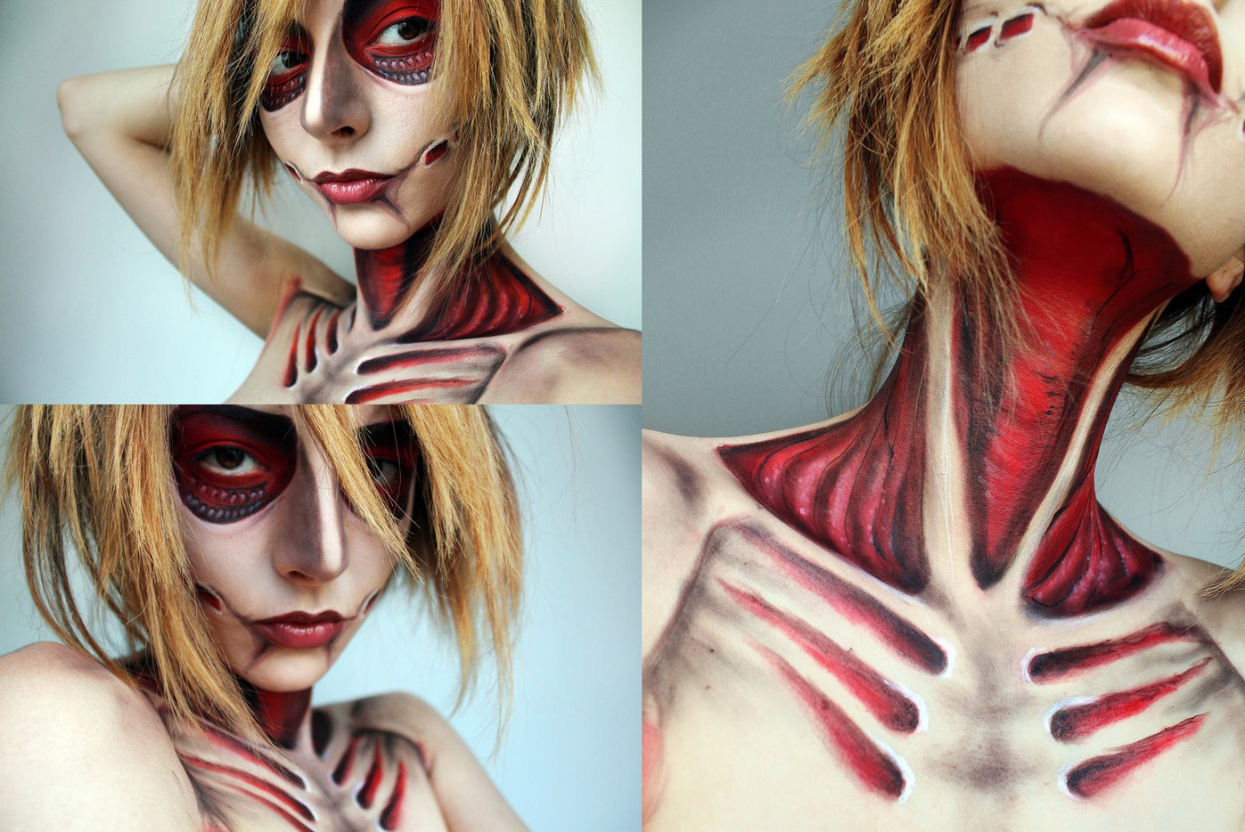 女巨人是在《進擊的巨人》中出現的角色。她擁有超群的智商,許多粉絲看過她在原作中踐踏許多無助的角色後,都對她留下深刻的印象。 Florea Flavia 是一名居住在羅馬尼亞的化妝師,她在 Facebook 上傳了她令人印象深刻的全臉巨人裝。