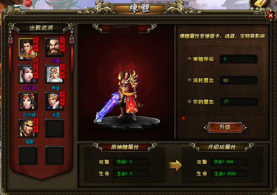 即日起,只要等級達到 80 級的玩家即可開啟煉體系統。在系統中,主公可通過使用靈血,不斷地強化和升級自己麾下武將的屬性,而每一次的升級都將使武將的攻擊力和生命值大幅提升,激發隱藏潛能,不斷超越自我,突破戰力上限!