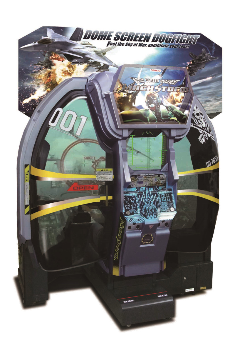 日本老牌娛樂機台大廠 BANDAI NAMCO Games 今年則是帶來體感空戰射擊遊戲《馬赫風暴(MachStorm)》,這款受知名空戰射擊遊戲《空戰奇兵(Ace Combat)》系列啟發的大型電玩遊戲,採用與《機動戰士鋼彈 戰場之絆》類似的半球型投影螢幕大型體感駕駛艙筐體,以東京、巴黎、邁阿密等現實世界都市為舞台,讓玩家駕駛各式戰鬥機,在半球型投影螢幕所呈現、能完整包覆玩家視野的廣闊天際展開激烈的超音速空戰,體驗穿梭在槍林彈雨與摩天大樓之間擊落敵機的快感。採用簡單直覺的操作,任誰都能輕鬆化身王牌駕駛員。搭載豐富體感機關,操縱桿與駕駛座會隨著戰況震動,還會以風扇製造超音速飛行的風切感,體驗超越好萊塢電影的身歷其境效果。