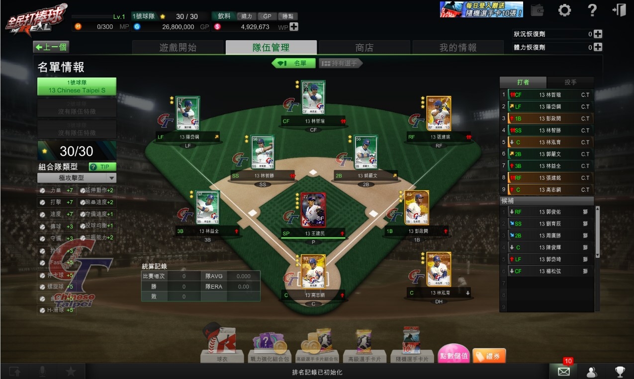 其中 2013 年世界棒球經典賽中,擔任中華隊隊長的「彭政閔」,首戰對上澳洲時,不但奮勇用肉身擋球,阻止對手上壘,更交出單場兩安打及 1 支全壘打的亮麗佳績,終場中華隊即以 4 比 1,3 分差距痛宰澳洲,奪下首勝。全新改版「彭政閔」將以 0.313 的優異打擊率讓球員卡榮登「A 等級」,幫助玩家取得更多制勝分數。此外,台灣之光「王建民」,不論是對上澳洲、日本,皆創下 6 局無失分的驚人表現,必殺技「伸卡球」更重現場上,讓所有觀賞的球迷讚嘆不已,改版將新增王建民的「S 卡」,完美的投球美技,勢必會封殺所有對手,勇奪勝利。
