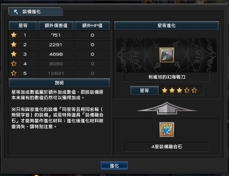 原始的裝備在強化之前都沒有賦予星數,而在星等進化系統當中,只要提供相同星等且同名的裝備,或者是同等對應的星等裝備融合石,就可以讓該武器 (防具) 的星等提升一階。每提升一星,能力值皆會大幅度提升,想要提升戰力就趁現在,趕快去收集素材把裝備星等提升吧!