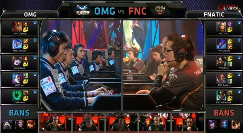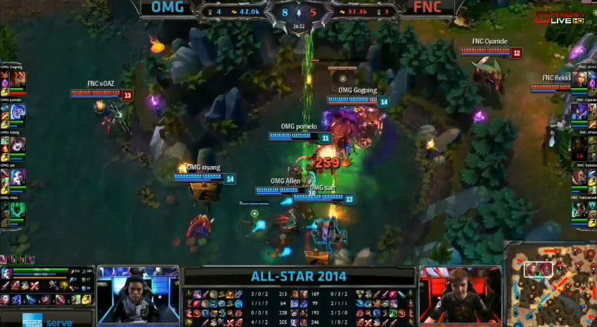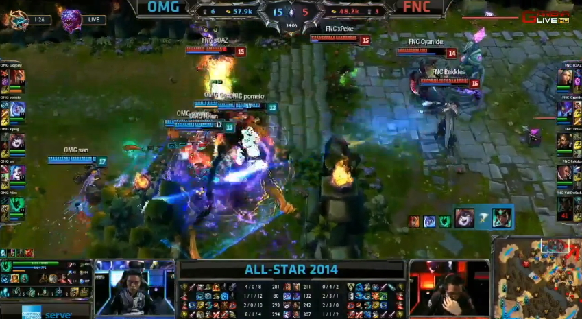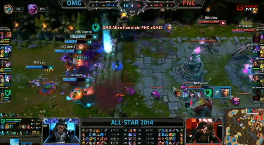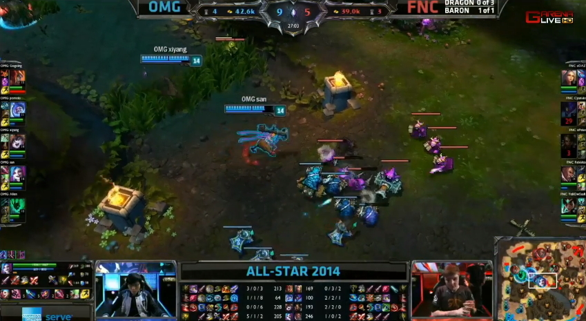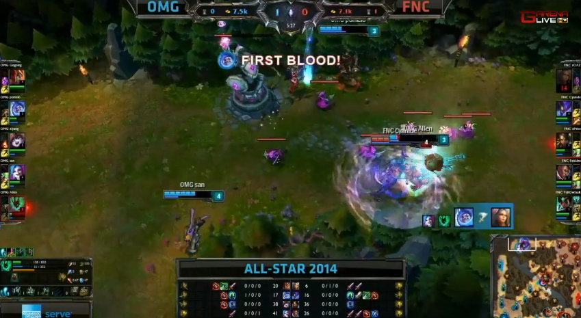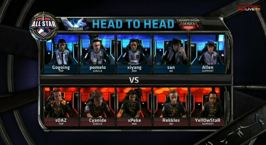 首場全明星邀請賽由中國 LPL 代表 OMG 對上歐洲 LCS 代表 Fnatic,比賽開始沒多久,雙方各拆掉對方的一座塔。接著 OMG 在巴龍區擊殺了 Fnatic 的奈徳麗後,想要吃掉巴龍,不過在巴龍快死時卻被 Fnatic 撿走,並取得了巴龍 Buff。然而,最後 OMG 還是善用戰術,取得了這場賽事的勝利。
