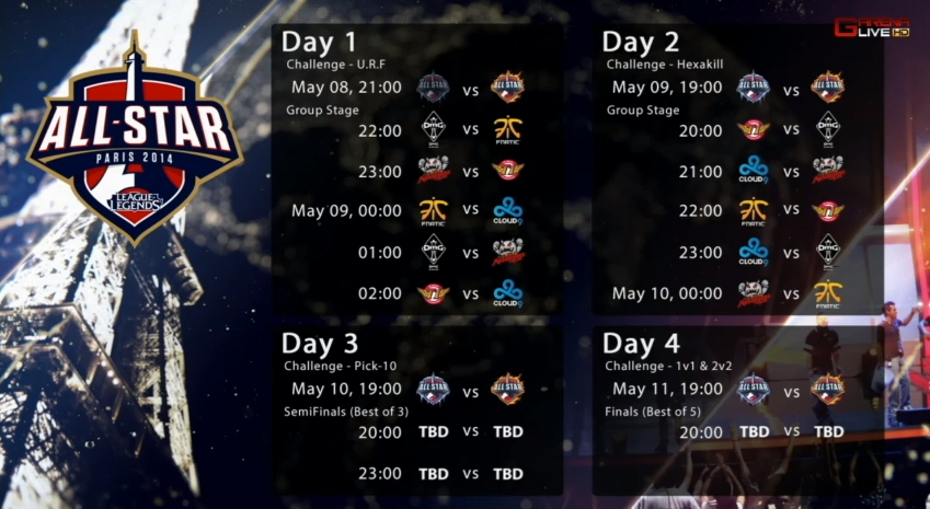 全明星賽分為全明星邀請賽與全明星挑戰賽,「全明星邀請賽」邀請北美 LCS 代表 Cloud 9、歐洲 LCS 代表 Fnatic、中國 LPL 代表 OMG、韓國 OGN 代表 SKT T1 K 及 Garena 區域 GPL 春季聯賽冠軍 AZB TPA 等五大聯賽冠軍較勁。
