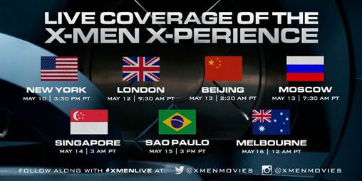 越來越接近《X 戰警:未來昔日》上映日了,從明天開始「X 戰警英雄巨星全球驚喜巡迴 X-Men X-Perience!」也將於紐約、倫敦、北京、莫斯科、新加坡、聖保羅及墨爾本等重要城市展開。
