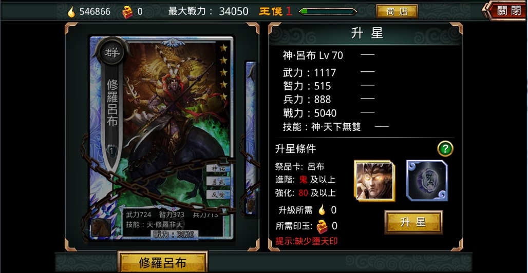 於 2.0 資料片中,率先登場為眾主公最期待的五星卡牌系統,玩家在遊戲中可透過升星系統,將呂布、太史慈升級成「鬼神呂布」、「修羅呂布」與「矢志太史慈」、「感古太史慈」。在升星的過程中,除了需要將主卡(呂布、太史慈)提升至「鬼.80 級」外,還需相關的覺醒石才可進行五星升級的舉動。至於覺醒石該如何取得,這部分就請各主公隨時留意粉絲團及官網的公告了。