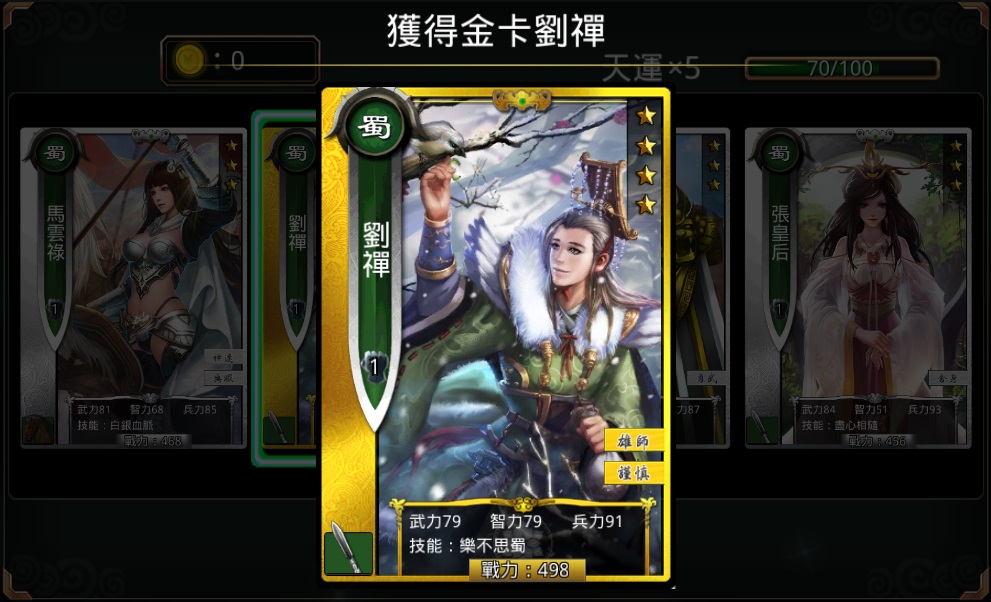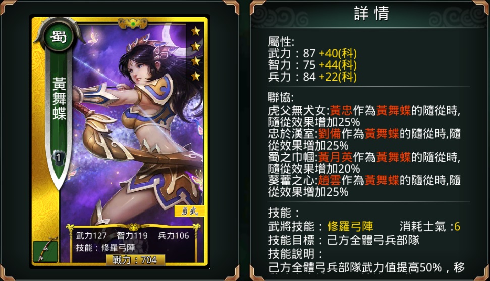 四星金卡的部分,這次追加蜀國兩位重要的人物,分別為「劉襌」與「黃舞蝶」,玩家均可透過抽卡取得。值得一提的是四星金卡的黃舞蝶,雖為蜀國武將,但主動技能發動時,可提升己方全體弓兵部分的武力值,讓目標「五弓」的玩家多了一名可用之兵,五弓族群的玩家們可別錯過這張好卡喔!
