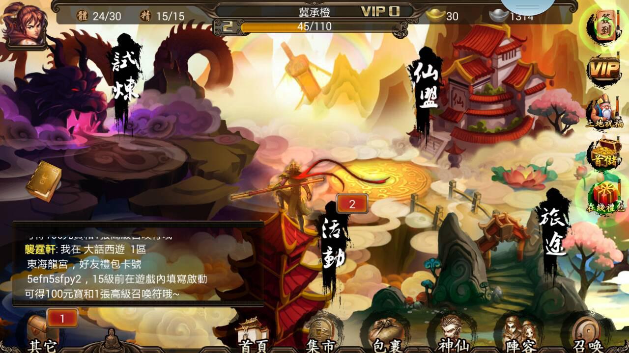 遊戲之中目前分為「旅途」、「試煉」、「仙盟」、「活動」這四種不同的模式,「旅途」就是一般的闖關劇情,是推進遊戲進程的模式;「試煉」則是額外的特別關卡,是讓玩家強化自己的角色所用,不同的時間也會不同的活動在這裡進行;仙盟就像是一般的公會一樣,加入後可以與其他玩家進行交流,但也是有等級限制的,如果等級不夠的話很多地方都無法進入。