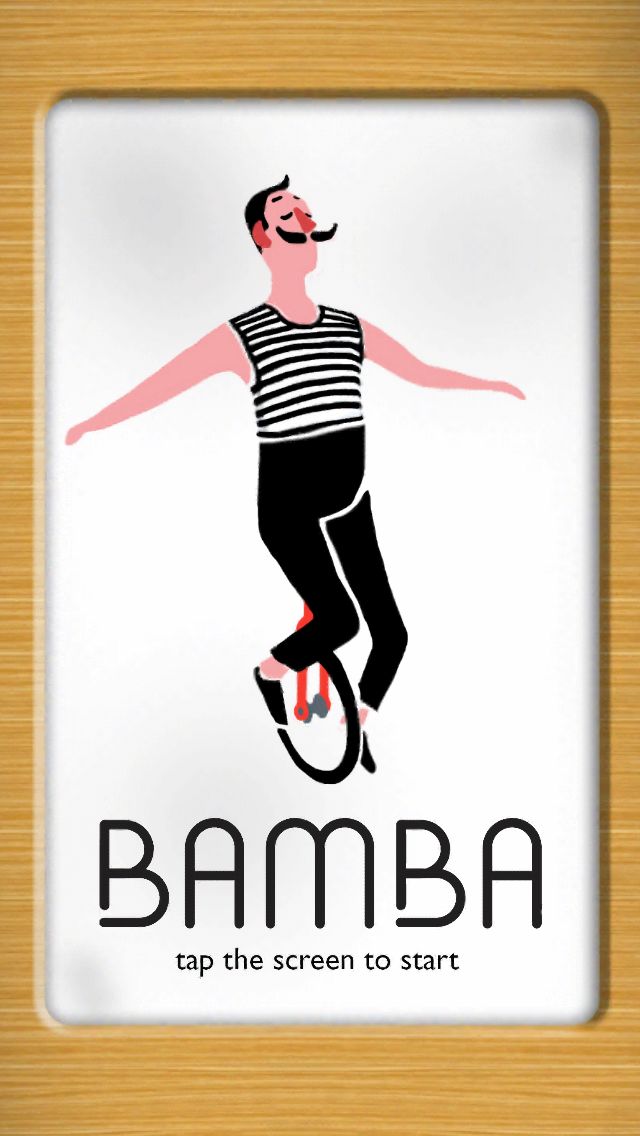 Bamba》的遊戲目的非常簡單,玩家需要操控在螢幕中央,踩著單輪車的大叔在一定的範圍內保持平衡,撐到限定的時間結束後就算勝利!不過因為雜技大叔要持續移動以控制單輪車平衡的關係,為了不讓角色跌出範圍外,這時玩家只要點一下螢幕就能讓單輪車向後移動改變方向,而再點一下則向前。