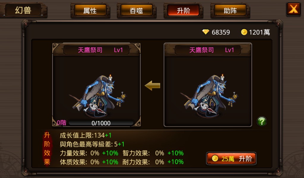 幻獸三大上限:成長值、屬性值、等級,完全可以通過升階突破,最多可以突破 5 次,屬性加成最高為 50%。升階過程需要消耗與自身完全相同的幻獸,換言之,現在重複了的同階同種幻獸也比過去有價值,發揮更大用途。