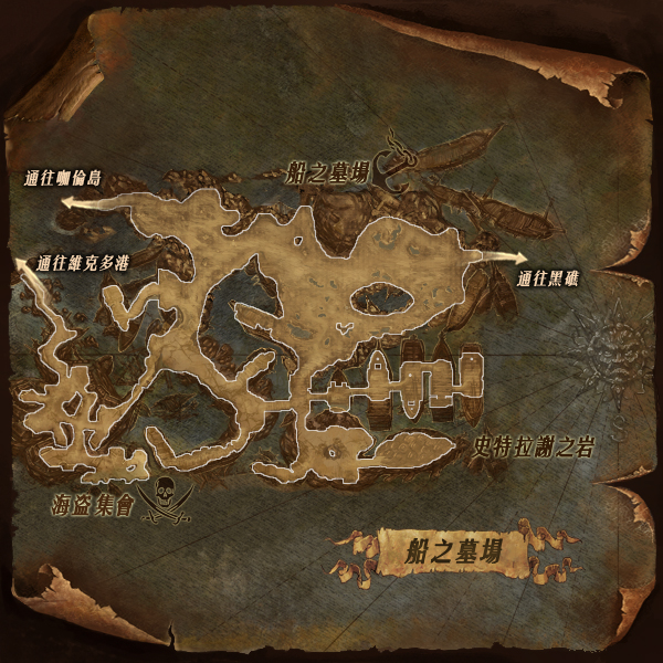 船之墓場的前身原先是商業海岸線最重要的貿易中繼站,是一個相當繁榮的據點。但卻沒想到邪惡的維京族為了強大利益以及權力擴展,不惜違背海洋的和平條款,召喚了深海巨妖利維坦,來佔領此地,而為了想要航行自由的海洋,雙方激烈衝突不斷,上百年已有無數的船隻殘骸被棄置,久而久之形成了一片不會下沉的浮木區域,囤積成一條罕見的海上人行通路。