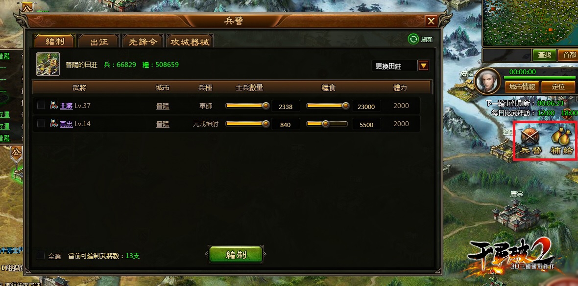 進行國戰的過程中,玩家可以利用系統右側「兵營」、「補給」,隨時調整士兵數量及糧食配給,提高戰鬥中軍隊調度的效率。