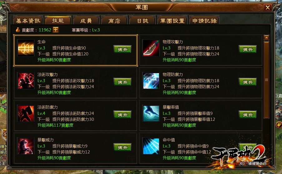 軍團系統不僅僅是提供特殊道具、獎勵,在遊戲中軍團提供技能學習,對應角色的「生命」、「攻擊」、「防禦」、「暴擊」、「命中」、「閃避」等等,除了技能提升軍團內擁有諸多玩法。軍團剿匪是軍團系統中的一個日常活動,團員們可以合力擊殺敵人,當一天內連續擊殺敵人數到達一定的量後,則會開啟更豐厚的獎勵,敵人的品質、難度、屬性皆不同,需要玩家們運用謀略來消滅敵軍,為團員帶來更多的獎勵。